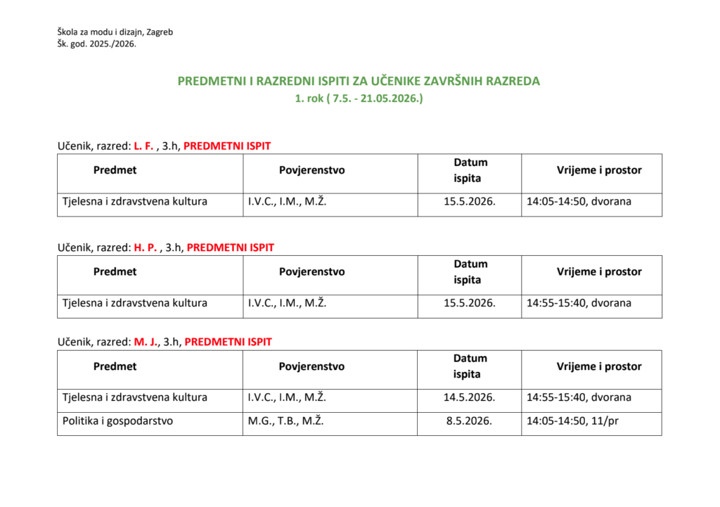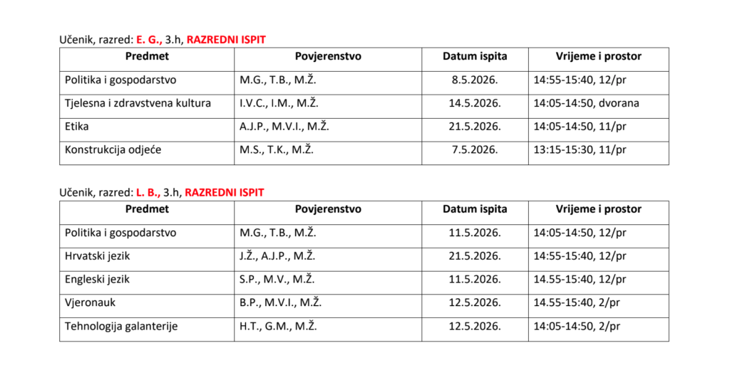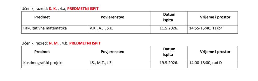 u nastavku donosimo termine za predmetne i razredne ispite.